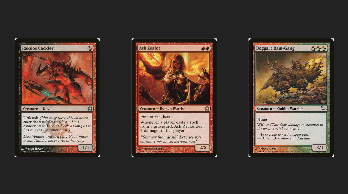 Turn 2, Ash Zealot and Rakdos Shred-Freak enter the battlefield with haste. This lets them to slip past sorcery-speed removal and get some damage in while the opponent is tapped out. They also surprise opponents that don’t leave behind enough blockers for themselves or their planeswalkers. These haste creatures are perfect after an opponent’s boardwipe, as they don’t have to worry about blockers getting in the way and keep the pressure on without a moment’s respite.
